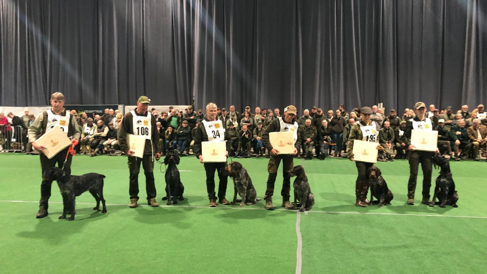 Am Samstagvormittag fand in Halle 5 der Holstenhallen die Zuchtschau statt. Auf dem Foto sind die “typvollen Hunde” der Hegewald-Zucht bei der Auszeichnung mit Ehrenpreisen zu sehen. Musikalisch begleitet wurde die Veranstaltung vom Jagdhorn-Bläser-Korps Neumünster.