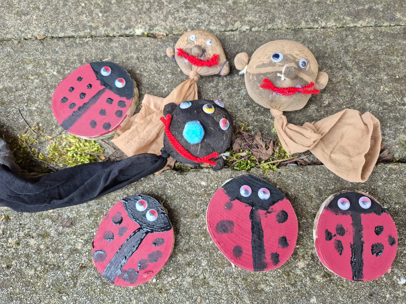 Im Anschluss wurde es kreativ. Aus Feinstrumpfsocken, Grassamen, Erde und Wackelaugen entstanden witzige Grasköpfe, die nun beim Wachsen beobachtet werden können. Außerdem gestalteten die Kinder aus Baumscheiben liebevoll verzierte Marienkäfer.