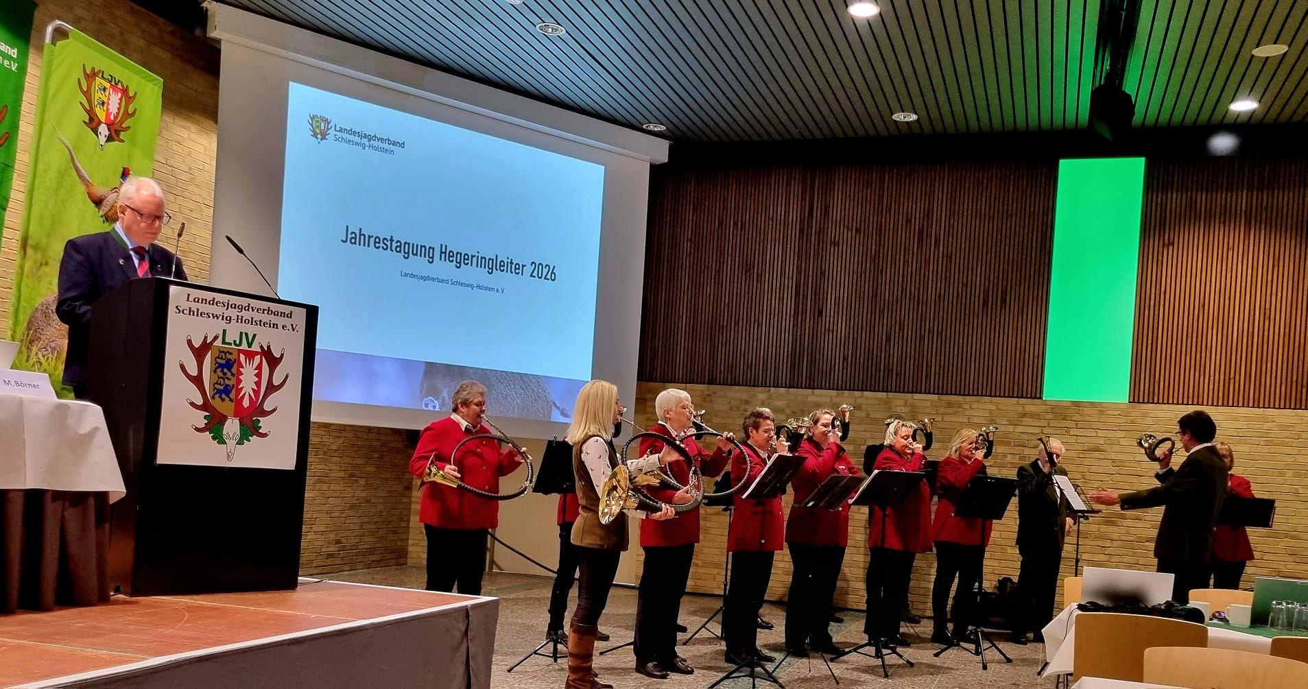 Die Hegeringleitertagung des Landesjagdverbandes Schleswig-Holstein fand am 31. Januar 2026 in den Holstenhallen in Neumünster statt. Wie in den Vorjahren hat das Jagdhornbläserkorps Neumünster die Teilnehmer musikalisch begrüßt.